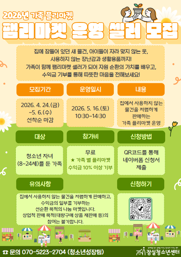 | 활동기간 | 2026-05-16 ~ 2026-05-16 | 참가비 | 무료 (가족 별 플리마켓 수익금 10% 이상 기부) |